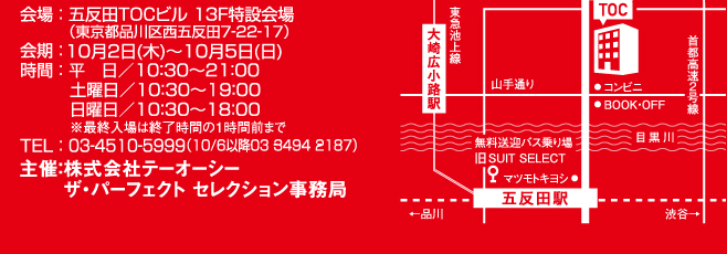 ※ | メール会員(プレミアムクラブTOC)にご登録いただきますと「The Perfect SELECTION」招待メールとお得なセール情報を受け取れます。ご登録いただく個人情報は、弊社TOCで開催されるイベントおよびTOCが主催・共催するイベントのみご招待・ご案内をさせていただきます。 また、お客様のご同意なしに業務委託先以外の第三者に開示・提供することは一切ございません。 |